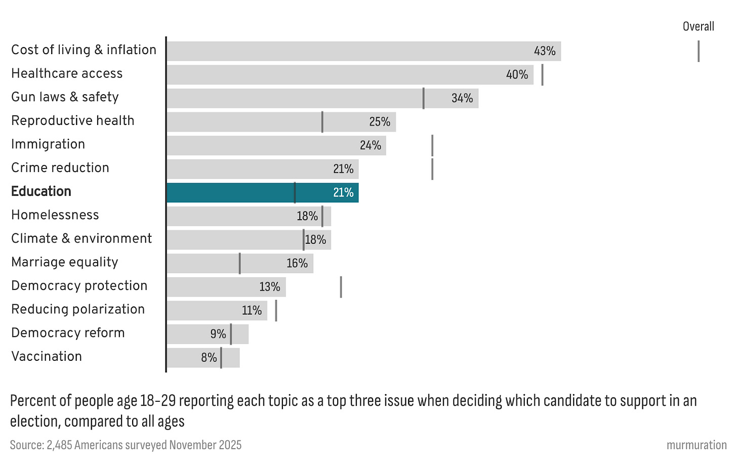 For young voters, this dynamic is especially pronounced. Gen Z is navigating high costs of living, student debt, and a volatile labor market. Education is not just about schools in the abstract; it is about whether learning, credentials, and job training will actually translate into financial stability.
