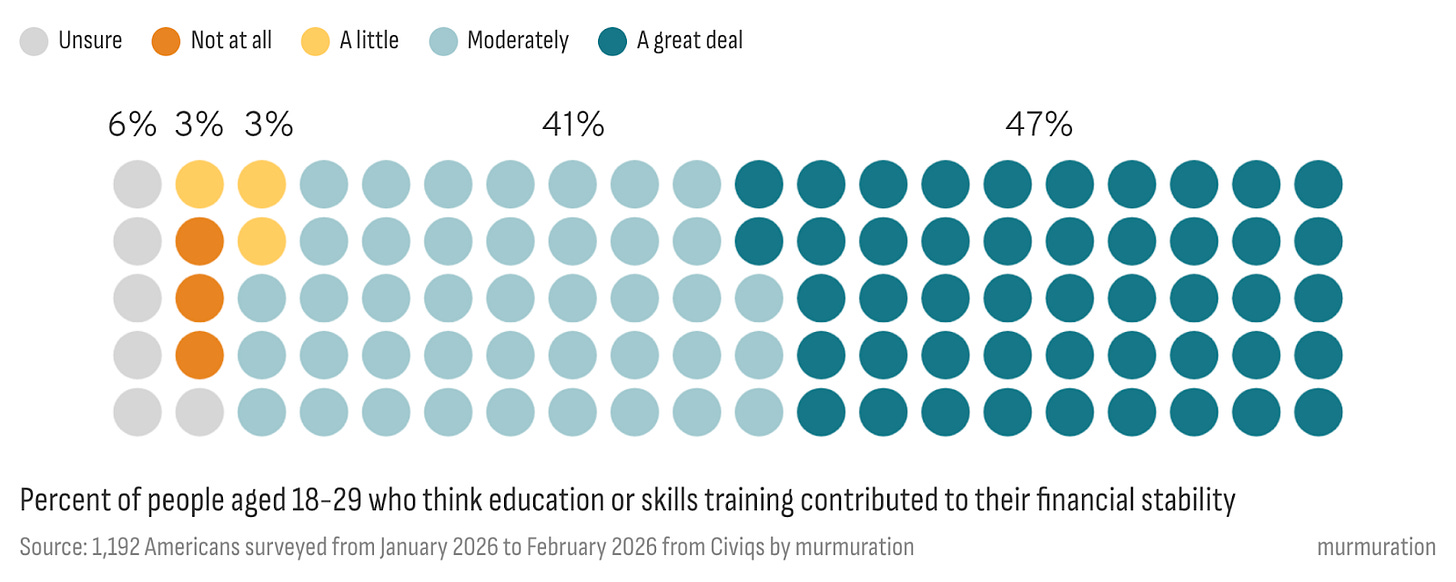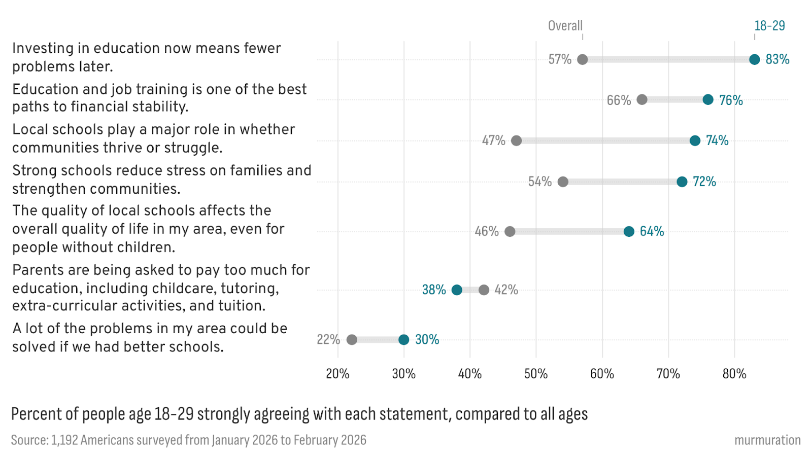 For Gen Z, these ideas land with particular force. Young adults are more likely than older Americans to strongly endorse the view that education shapes economic outcomes, community stability, and the future health of society. In their own words: